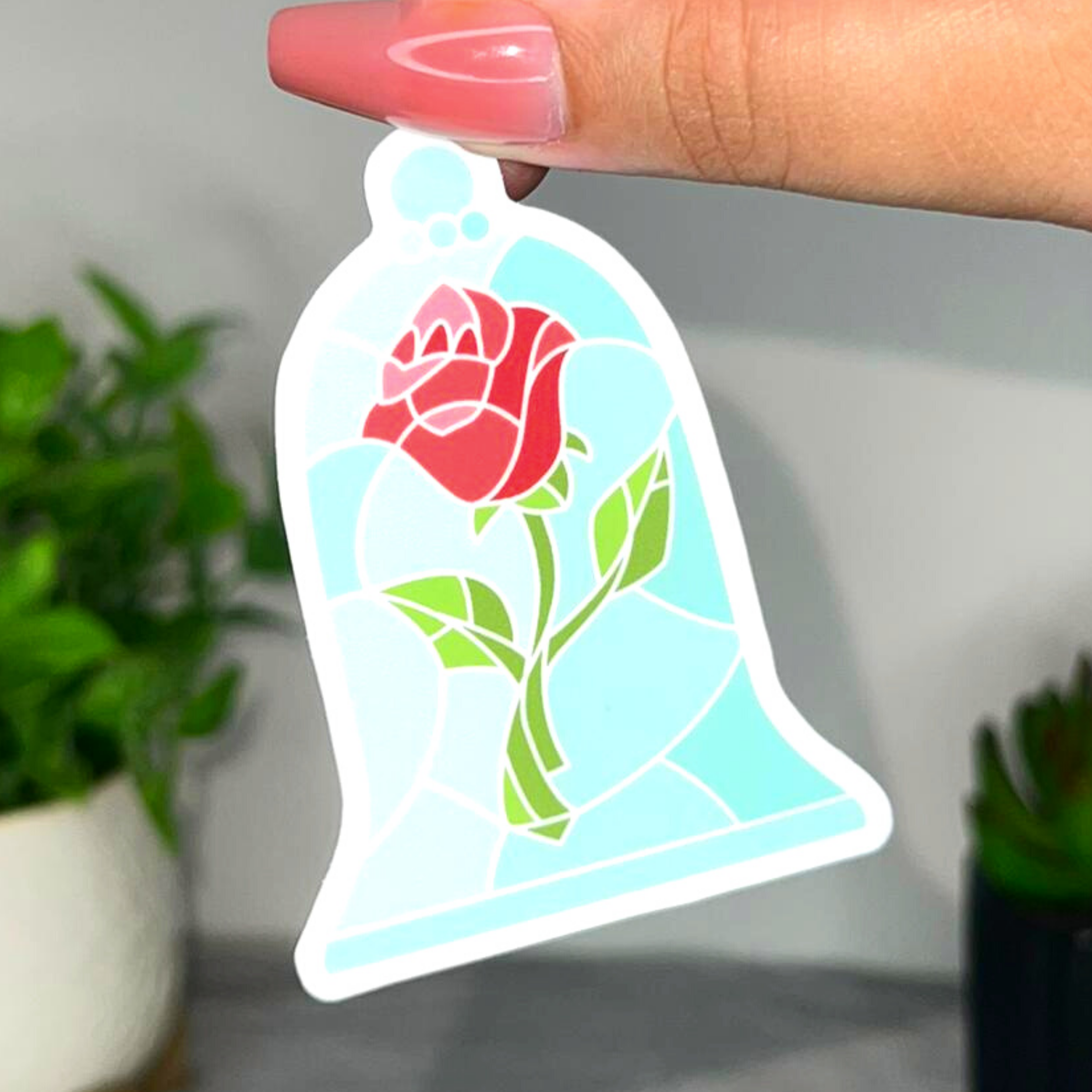 Hermoso sticker que simula la rosa resguardada en una campana de cristal, en la película de La Bella y la Bestia, en un acabado mate. Es parte de una colección de t-shirt, mug y hoodie. Nuestros stickers son a prueba de agua, así que, los puedes pegar del auto, la computadora, tableta, tus vasos, tazas, etc.